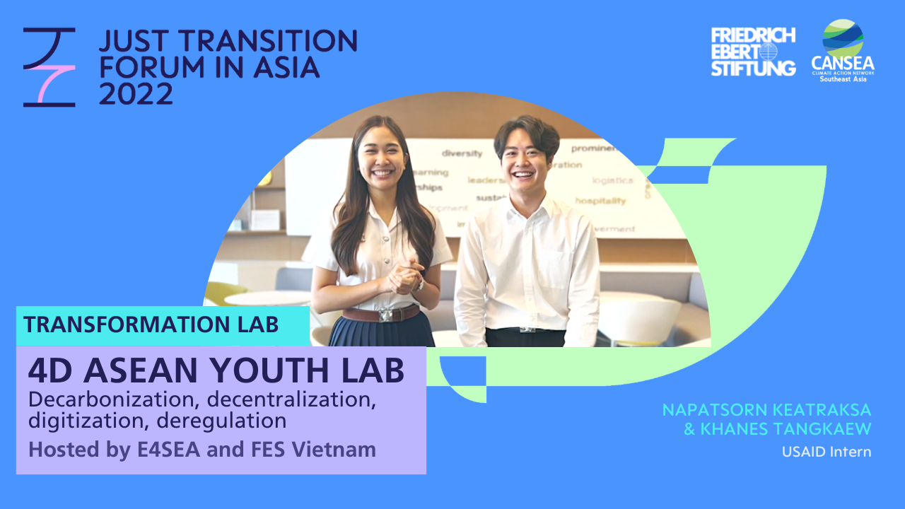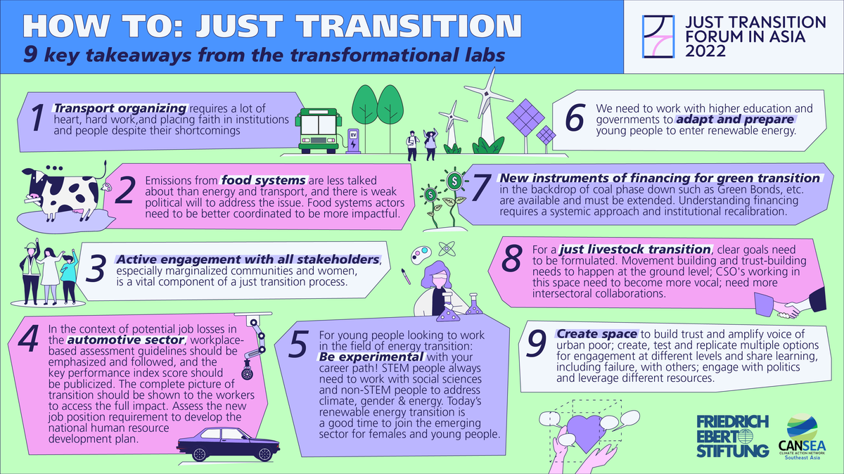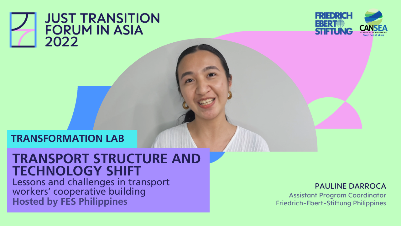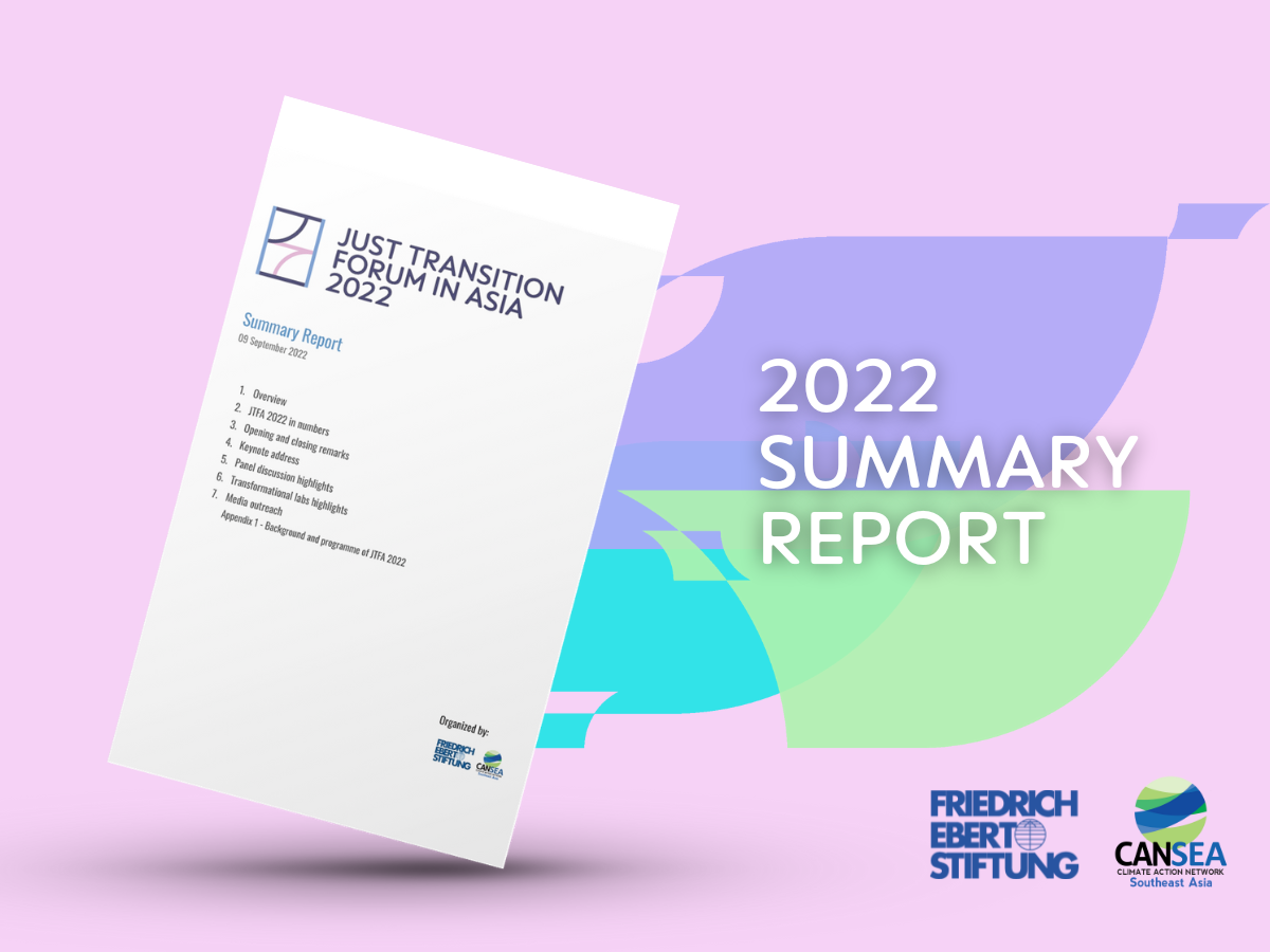 The second Just Transition Forum in Asia welcomed more than 500 participants to join Friedrich-Ebert-Stiftung and Climate Action Network Southeast Asia online from 7-9 September 2022 to discuss how this just transition pathway in the fields of energy, mobility and agriculture can look like. With distinguished keynote speakers, two panel discussions and nine laboratory sessions, JTFA brought together perspectives from practitioners, policy makers, researchers and activists to define the next practical steps of how we can move forward towards a just transition in Asia.